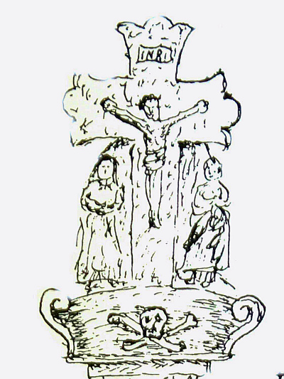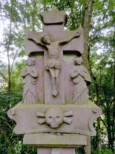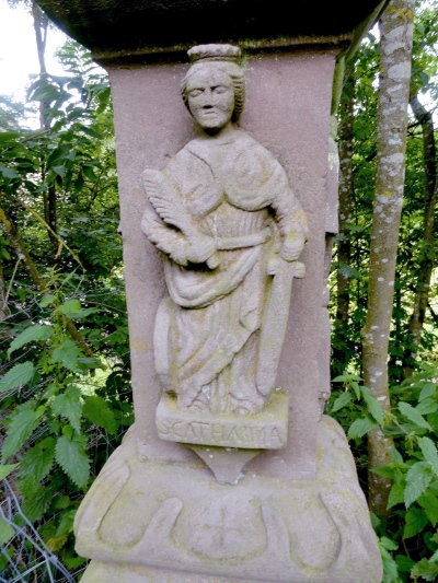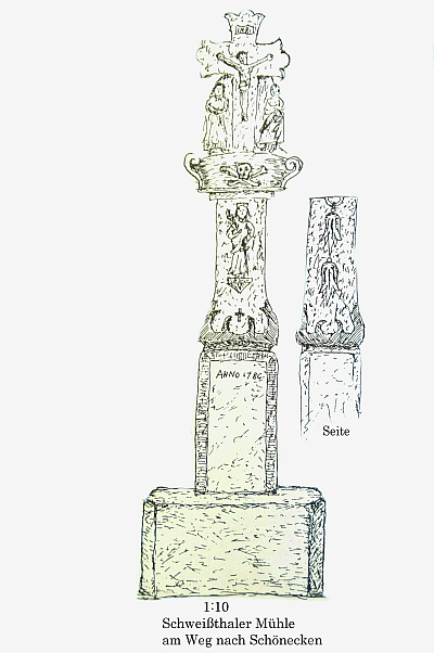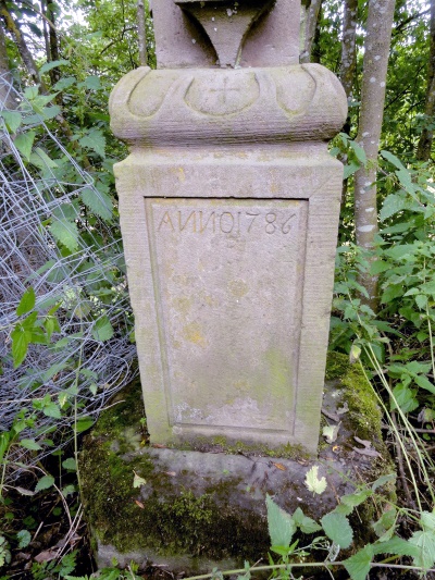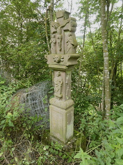 Gut erhaltener Kreuzigungsbildstock von 1786. Am schweren, glatten Fuß nur die Jahresangabe. Der etwa gleich hohe Schaft am unteren Ende polsterartig verdickt und seitlich mit je zwei Glockenblüten verziert, vorne die inschriftlich benannte Relieffigur der heiligen Katharina. [1]