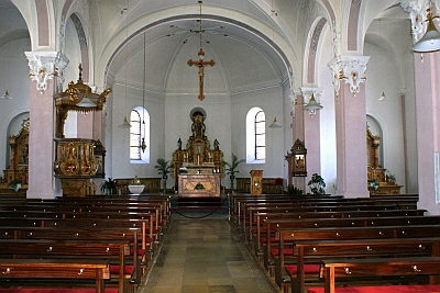 Saalbau von 1780-84, erbaut von Johann Baptist Bingler aus Trier. 1911 von Johann Goergen zur dreischiffigen Stufenhalle erweitert. Neubarocke Ausstattung erhalten. Hochaltar und Kanzel Rokoko. [1]