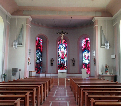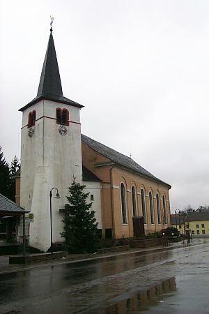 Klassizistischer sechsachsiger Nachfolgebau der zweiten, zum noch vorhandenen Turm gehörigen romanischen Kirche, die 1823 abgebrochen wurde. Die jetzige Kirche steht axial vor dem romaischen Turm, der etwa aus dem Jahre 1000 stammt. Das Innere der Kirche wurde mehrmals umgestaltet. [1]