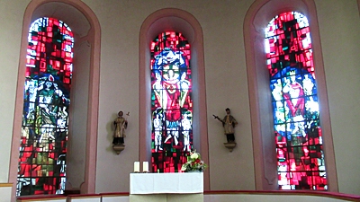 32°: steht der Turm zur derzeitigen Kirchenschiffsachse versetzt, eine Folge der Neuausrichtung der Längsachse beim Neubau der Kirche 1825.