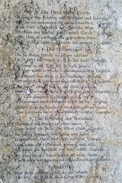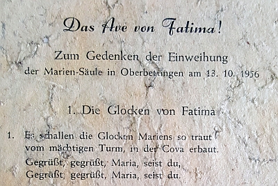 Pfarrer Schneider verdanken die Oberbettinger nicht nur Idee, Initiative und Verwirklichung der Mariensäule, sondern auch den frommen Brauch einer Lichterprozession. Einmal im Monat zog sie nach einer Andacht in der Oberbettinger Kapelle (seit 1960 erweitert zur Dorfkirche) von hier zur Mariensäule im Schein der entzündeten Kerzen. Man sang dabei Das Ave von Fatima. Das war, so berichten etliche heute ältere Teilnehmer, immer feierlich und einzigartig in unserer Gegend. Das Lied erzählt in sechs Abschnitten mit insgesamt 22 Versen die Erscheinungsgeschichte der Muttergottes in Fatima. Mit dem Schlussvers dieses Marienliedes möge auch mein Aufsatz ausklingen: Hab Dank, o Maria, dass du uns bestellt, Mit Eifer zu schaffen die bessere Welt! Gegrüßt, gegrüßt, Maria, seist du. [1]