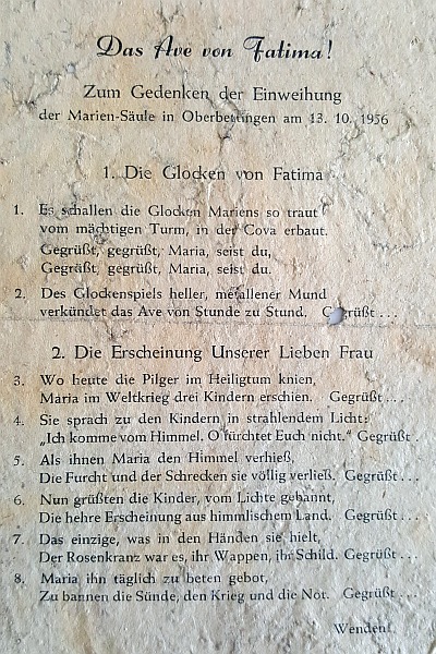 Sein Wunsch war es, eine Marien-Säule zu errichten als weithin sichtbares Segensund Mahnzeichen, als stille Hilfe für den Frieden in der Westeifel und der Welt. Darin war sicher auch der für eine Dorfgemeinschaft wie Oberbettingen so wichtige örtliche Friede, etwa zwischen den verschiedenen Gruppen, mit eingeschlossen. Ohne die Tatkraft und Begeisterung der Dorfgemeinschaft wäre die Idee des Pastors nicht verwirklicht worden. Grundsteinlegung und Einweihung: Beide symbolischen Akte wurden am Ort gehörig gefeiert und zum Glück der Nachwelt auch von den Schul-Chronisten anschaulich beschrieben. So berichtet Lehrer Herbert Andersch am 31. 7. 1955 in der Oberbettinger Schulchronik: Am 31. Mai 1955 legte Herr Pfarrer Ludwig Schneider auf der Schutt vor dem Schulhof den Grundstein zur Oberbettinger Mariensäule. Eine Urkunde wurde in den Grundstein eingelassen, unterzeichnet vom Pastor, dem Ortsbürgermeister Feltges, dem Brandmeister der Freiwilligen Feuerwehr Johann Ganser und dem Leiter der Deutschen Jugendkraft Don Bosco. Die Angehörigen der Gemeinde nahmen zahlreich an der Feier teil. Ungefähr eineinhalb Jahre später berichtet Anderschs Amtsnachfolger, Lehrer Josef Jakob, über die Einweihung der Mariensäule in der Chronik: Am 14. 10. 1956 wurde die Mariensäule eingeweiht. Auf einem 6 m hohen Sockel steht die Marienfigur. Zum Teil in freiwilliger Arbeit haben die Oberbettinger dieses Marienmal errichtet. Pfarrer Schneider (als geistlicher Initiator) hat ein gutes Jahr manche Stunden opfern müssen, um nach seinem Plan das steinerne Muttergottesbild über Oberbettingen errichten zu können. (a.a.O., S. 156). Auf ausdrücklichen Wunsch von Pfr. Schneider sei hier festgehalten, dass er das in der Schul-Chronik vermerkte Datum der Einweihung (14. 10. 1956) für falsch hält. Er besteht darauf, dass die Einweihung der Säule am Sonntag, dem 13. Oktober 1957, also ein Jahr später, stattgefunden habe. Dies sei exakt der 40. Jahrestag der dritten Erscheinung in Fatima gewesen. Die Erinnerungsfähigkeit der Oberbettinger ist daher gefragt. Auch, damit eine etwaige Feier 50 Jahre Mariensäule in Oberbettingen nicht im falschen Jahr stattfindet.