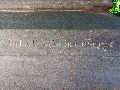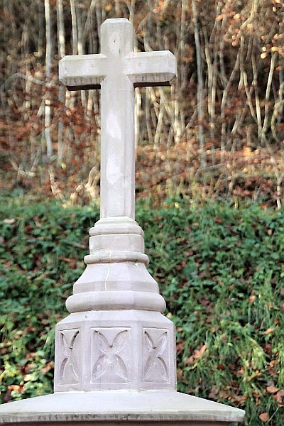 Der hohe Sockel auf gestuftem Unterbau enthält an der Vorderseite in spitzbogiger Rahmung eine große Inschriftplatte mit einem religiösen Spruch und den genannten Errichterangaben und trägt das schlanke Abschlußkreuz, das nochmals durch einen ornamentierten und profilierten Fuß erhöht wird. Die Einzelformen zurückhaltend neugotisch. [1]