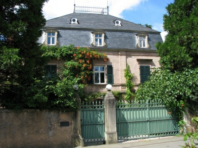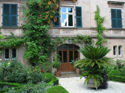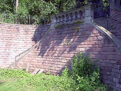 Der mächtige Walmdachbau gegenüber der Kirche ist straßenseitig von einer Mauer umgeben, saarseitig unterstützt die erneuerte geböschte Hangmauer aus Quadersteinen die dominante Schauseite. Die bogige zweiläufige Freitreppe ist hier axial auf den Baukörper bezogen.