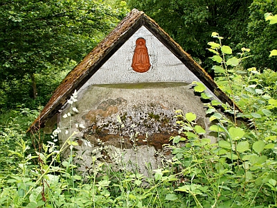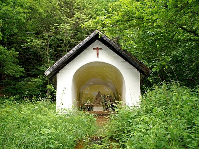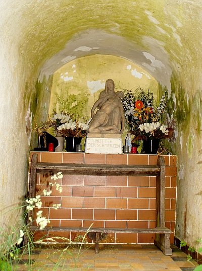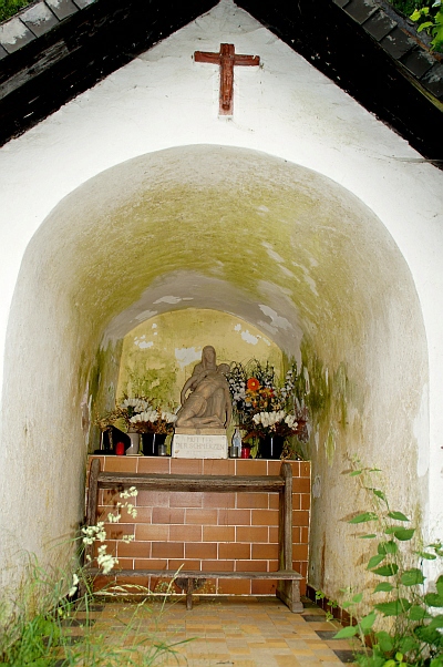 Am Aufstieg vom Grimburger Hof zur Grimburg. Um 1860 vom Henterner Förster Stefan Horn errichtet. Im Innern eine Statue der Schmerzhaften Muttergottes. [...] Die alte Statue war 1939 / 40 beschädigt worden, so daß der Besitzer 1951 eine neue Muttergottes in Speicher von dem Tonformer Klein bestellte, die heute noch hier steht. Im selben Jahr wurde das Dach der Kapelle erneuert, und 1987 erhielt sie einen neuen Anstrich. [1]
