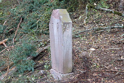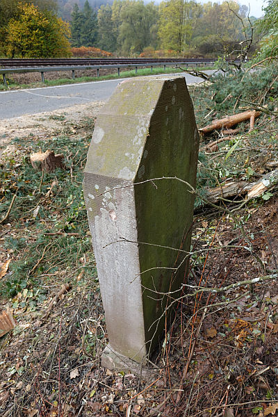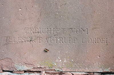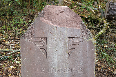 Schrifttafel aus rotem Sandstein in einer Haltebucht der Bundestraße 422 gegenüber der ehemaligen Bahn-Haltestelle Ramstein.