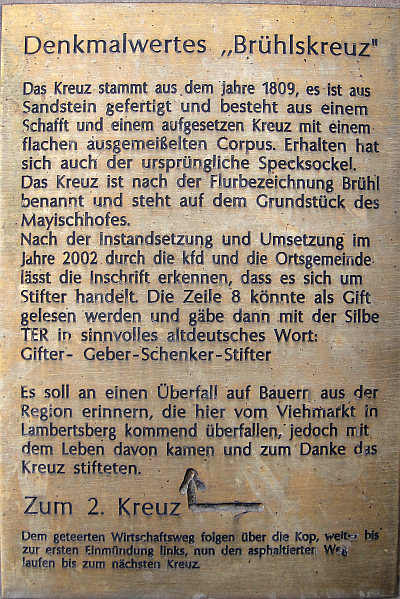 Das Kreuz stammt aus dem Jahre 1809, es ist aus Sandstein gefertigt und besteht aus einem Schaft und einem aufgesetzten Kreuz mit einem flachen ausgemeißelten Corpus. Erhalten hat sich auch der ursprüngliche Specksockel. Das Kreuz ist nach der [früheren Anm. d. Red.] Flurbezeichnung Brühl benannt und steht auf dem Grundstück des Mayischhofes.