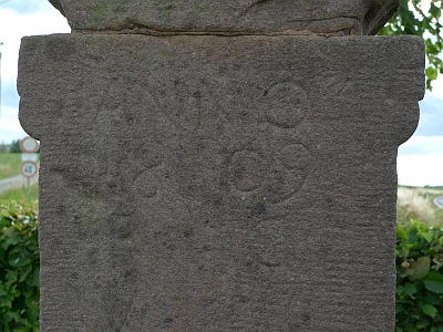 Von der Inschrift an der Schaftvorderseite ist nur noch die Jahreszahl eindeutig lesbar. Über den Spiegelfeldern befindet sich ein flacher Korpus in einfacher Steinmetzarbeit an doppelt gespaltenen Balkenenden. [1]