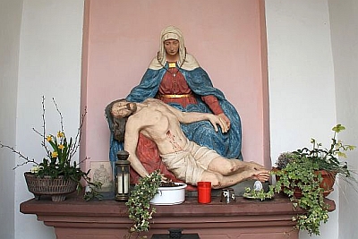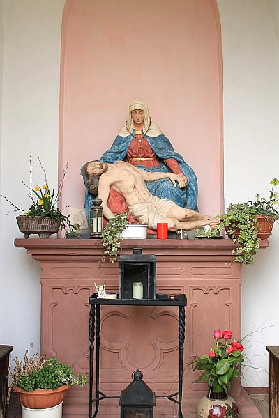 Hohe, spitzbogige Blendnischen auf den Längsseiten und eine entsprechende Öffnung auf der Vorderseite charakterisieren die Votivkapelle aus gelbem und rotem Sandstein. Alle vier Außenwände sind übergiebelt, im kreuzgratgewölbten Inneren hat auf einer Altarmensa mit Blendmaßwerk eine Pietà Platz gefunden. In die Rückwand ist der 1688 datierte Schaft eines barocken Wegekreuzes eingebaut. [2]