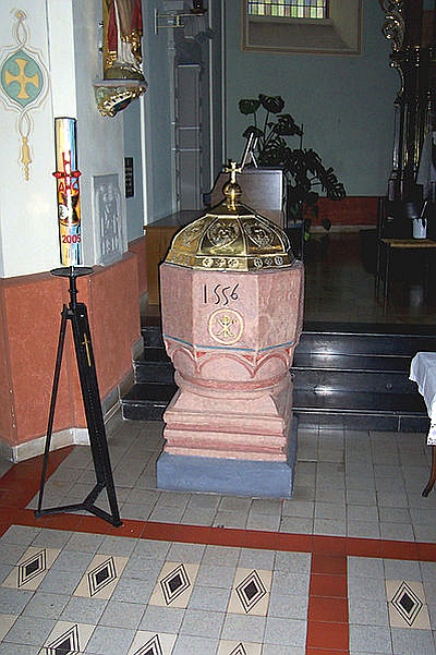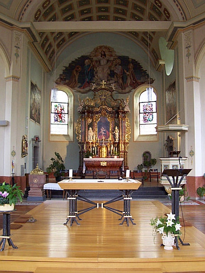 1910-11 von Peter Marx, Trier, errichtet. Bedeutender Bau wegen der frühen Verwendung von Eisenbeton. Hochaltar und rechter Seitenaltar im Rokokostil. [2]