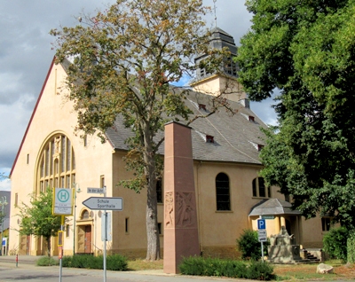 Architektonisch bemerkenswert ist das große 7teilige Rundbogenfenster über dem Haupteingang. Während des zweiten Weltkrieges trug die Kirche infolge Artilleriebeschusses erhebliche Schäden davon. Dabei wurden auch die großen kunstvoll gestalteten Bleiglasfenster zerstört und konnten nach dem Kriege nicht mehr ersetzt werden.
