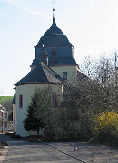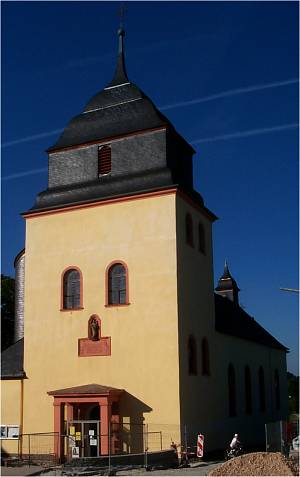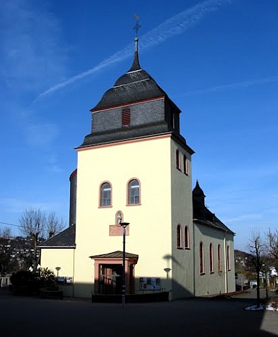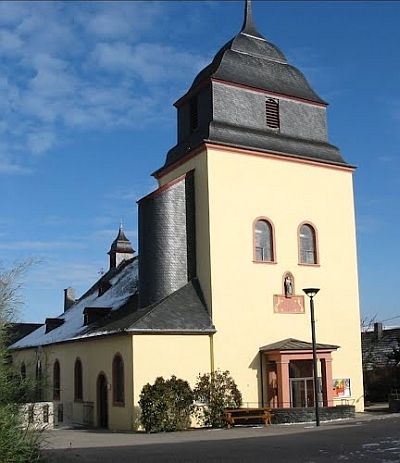 1805 errichteter, barock wirkender Saalbau. 1860 erweitert und 1914-15 von Ernst Brand, Trier, nochmals vergrößert. Altaraufsatz aus Stein, um 1540 mit Vesperbild und kniendem Stifter. [1]