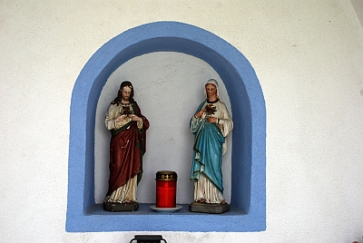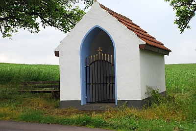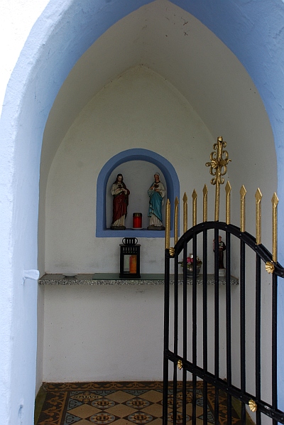 Sich in einfachem Spitzbogen öffnender, geradegeschlossener Putzbau, darin in Nische eine Pietà und die drei Marien. [2]
