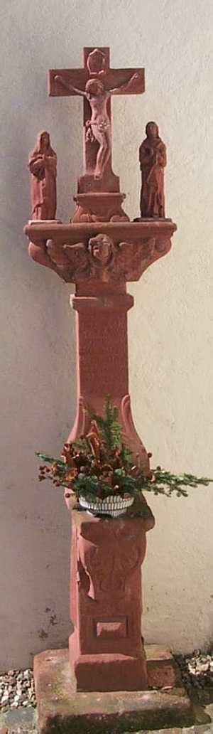 Im südlichen Winkel zwischen Schiff und Chor ein Kreuzigungsbildstock, bezeichnet 1702 [3]