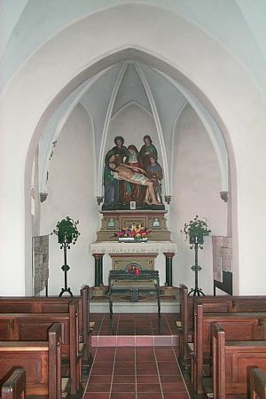 Im Innern auch ein auf Metallplatten gemalter Kreuzweg und das aus der Erbauungszeit stammende Gestühl; die Fenster neu.
