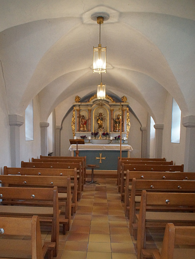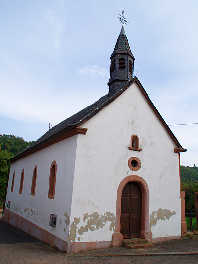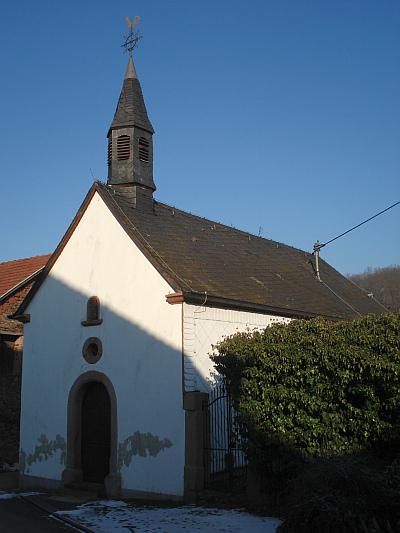 [...] Am rundbogigen schlichten Sandsteinportal die Datierung 1718. Der sechsseitige Giebelreiter verschiefert und mit spitzem Helm. Das Innere über Wandpfeilern tonnengewölbt mit Stichkappen.