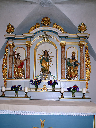 Barocker Holzaltar über verkleideter Sandsteinmensa. Dreiteilige, von korinthischen Säulen gegliederte Nischenwand mit seitlich geraden, über der Mittelnische aufgebogenem Gebälk. In der Mittelnische die Kirchenpatronin, darüber der heilige Geist und seitlich im szenischen Zusammenhang zur Aufnahme Mariens in den Himmel Christus auf Wolken links und Gott Vater mit Tiara rechts. In Gebrauch ein 1762 datierter, ehemals für Dorfkirchen typischer Weihwasserkessel. Der seitlich der Filialkirche anschließende, bruchsteinummauerte, aufgelassene Friedhof ist Teil der geschützten Umgebung.