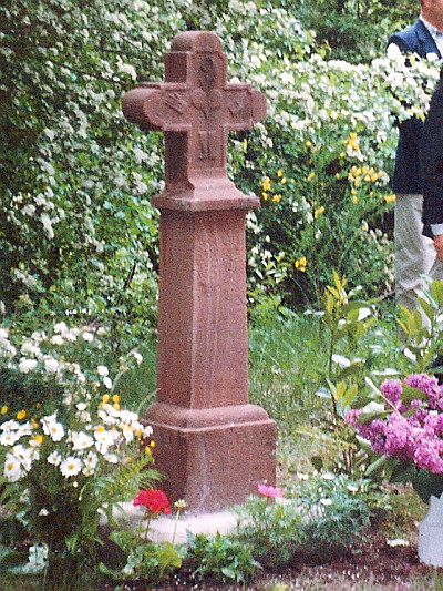 Schaftkreuz aus rotem Sandstein, 1,42 Meter hoch. Dargestellt werden die fünf Wundmale Christi: zwei Hände, Füße, Herz und Dornenkrone.