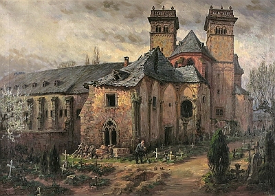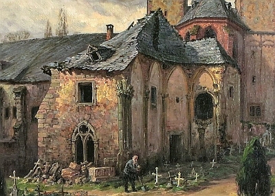 Zum Bild: Anton Schneider-Postrum: St. Matthiaskirche in Trier mit abgetragener Marienkapelle, 1910, Öl auf Leinwand, 60,8 x 85,6 cm, Museum Am Dom Trier, Inv. M 233.