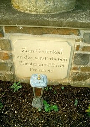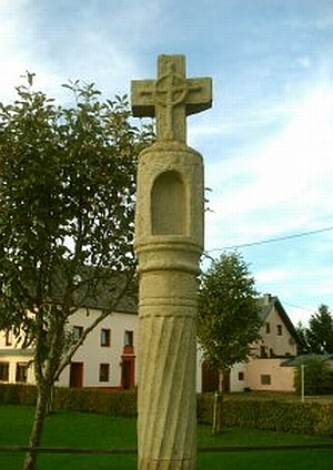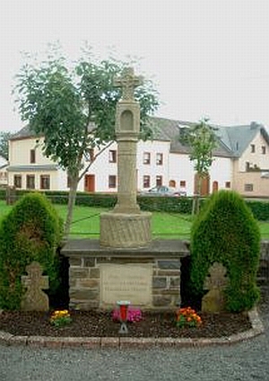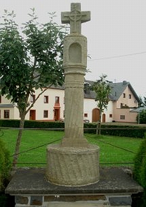 In der Kirchhofsmauer [heute vor der Kirche. Anm. d. Red.] findet sich ein Nischenkreuz auf einer gedrehten Sandsteinsäule und befestigt in einem Fundamentstein. Entstehungszeit war vermutlich um 1623, als der damalige Pfarrer Jakob Pott (1613-1636) in Daleiden die Kreuze für die sieben Kniefälle errichten ließ. [1]