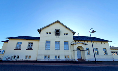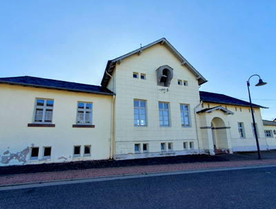 [...] Rein formal sind hier zwei Musterbauten preußischer Schulhäuser über einem T-förmigen Grundriß vereinigt. Im längs zur Straße stehenden (traufständigen) Gebäudeteil befand sich die Lehrerwohnung, in dem etwas höheren Flügel mit Glockengiebel das Klassenzimmer.