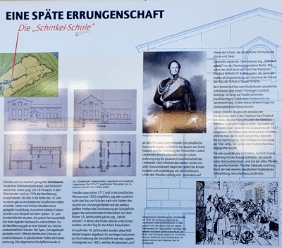 Dieses stilreine Zeugnis des preußischen Klassizismus steht in der Tradition Karl Friedrich Schinkels, der die Pläne als Leiter der Oberbaudirektion zumindest begutachtete. Das daher als "Schinkelschule" bezeichnete Gebäude wurde 1877 umgebaut [...]. [2]