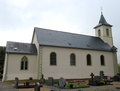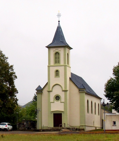Die in der Landschaft dominierende Saalkirche hat ein gestrecktes Langhaus. Der eingezogene Chor ist ebenfalls unter einem schiefereingedeckten Satteldach, das einseitig über die Sakristei abgeschleppt ist.