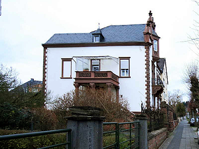 Der figürliche Schmuck an dem durch Renaissance- und gotische Motive festlich herausgeputzten Baukörper nimmt Bezug auf den Beruf des Bauherren. Die Brüstungsfelder tragen die Darstellung eines weiblichen Kopfes mit Strahlenstern und einer blitzebündelnden Hand, beides damals schon geläufige mythologisierende Allegorien auf die Elektrizität. Trotz Kriegsbeschädigungen sind im Innern die Treppe mit eisernem Geländer und figürlicher Stuck aus der Entstehungszeit erhalten, ebenso die aufwendige Umzäunung mit Sandsteinpfeilern und schmiedeeisernem Gitter. [1]