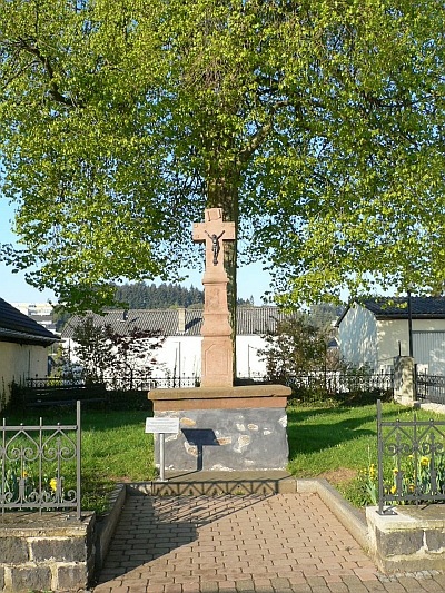 Standplatz war der "Kampbüchel" (campus=Feld; Bühel=Hügel) die mittelalterliche Hochgerichtsstätte des Amtes Daun (ab 14. Jahrhundert). Um 1714 stifteten Dauner Grafen hier die "Kampbüchelkapelle" mit regelmäßigem Gottesdienst. Sie wurde 1824 wegen Baufälligkeit abgerissen; als Erinnerung dieses Kreuz vor einstigem Gerichts- und Altarstein aus Basalt. 2008: Restauriert durch Eifelverein Daun. [1]