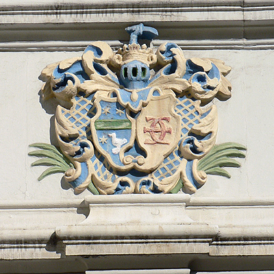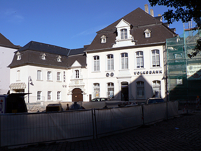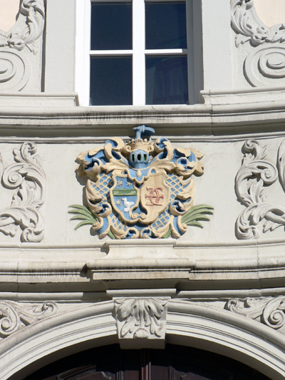 Das die Nordwestecke des Stockplatzes einfassende Nebengebäude umfaßt einen schmalen, langgestreckten und vorstoßenden Trakt, der mit einer überbauten Toreinfahrt an das Haupthaus anschließt. Platzbildprägender Blickpunkt bildet die barocke, das Stilgefühl Walters verratende Toreinfahrt-Fassade (vgl. den Votivaltar in der Jesuitenkirche von 1727 oder den 1732 datierten Portalbau von Sankt Gangolf): Der dynamische, reich dekorierte Aufbau wird eingeleitet durch schräggestellte Pilaster mit segmentbogigen Giebelstutzen, die ein flacher Stichbogen übergreift. Darüber die Wappen von Alexander Wilhelm Sonnier und Maria Ludovika Antonia Umbscheiden.