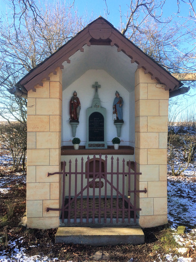 Das [...] an einer Baumgruppe stehende Kapellchen wurde 1900 von privater Seite an der Straße von Harspelt nach Lützkampen erbaut. Dort stand früher einmal ein Pestkreuz [...]. Den Fuß des ehemaligen Pestkreuzes mit der Zahl 1600 mauerte man in die Rückwand [der Kapelle] ein. [...] Weiter sind im Innern der Kapelle die Schutzheiligen gegen Blitzschlag und Feuer, Sankt Donatus und Sankt Florian dargestellt. Kein geringerer als der Eschfelder Maler-Pfarrer Christoph März hat die Kapelle einst ausgemalt.