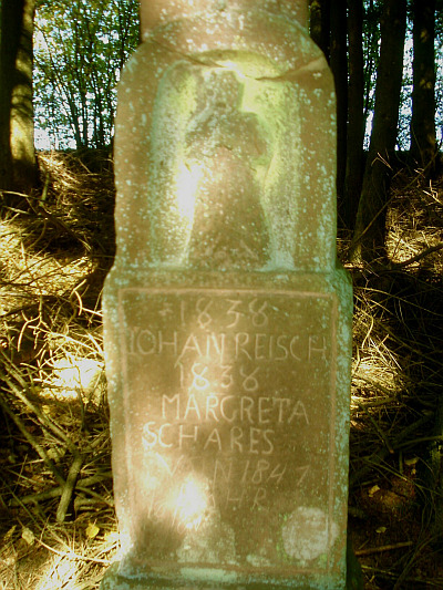 Schaftkreuz in altem Fundamentstein aus dem Jahr 1838 am Feldweg ins Tal des Burscheider Baches. Hier wird der typologische Übergang zum Sockelkreuz deutlich: der Schaft hat nicht mehr die für Schaftkreuze typische Säulenform, besteht aus einem Sockel, der als hohe Inschriftenplatte mit den Namen
