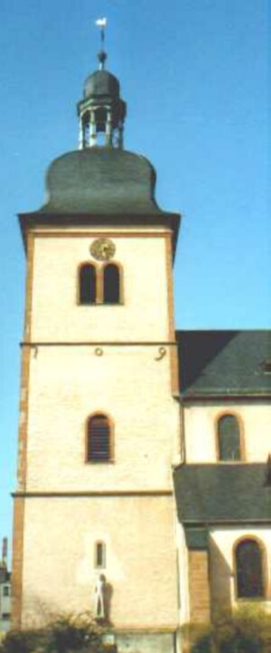 Die beim Stadtbrand von 1707 zerstörte mittelalterliche Kirche wurde 1708-24 nach Plänen des kurtrierischen Hofbaumeisters Philipp Honorius Ravensteyn wiederaufgebaut. Gewölbte Pfeilerbasilika mit Westturm und Chor. [1]