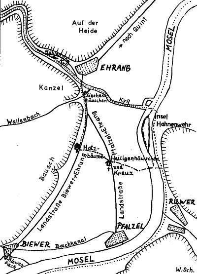 Dann umschreibt das Ehranger Weistum von 1592 allerdings einen bedeutenden Landstrich rechts der Kyll als Ehranger Gemarkungsteil: "die halbe Mosel aus (= aufwärts) bis oben an einen Graben, dort auf dem Staden, den Graben hinaus bis unten an Pfalzeler Kreuz, da steht eine Marke neben der Straße (gemeint ist das Kreuz beim Heiligenhäuschen an der Landstraße Ehrang-Pfalzel), von der Marke an bis unter Hoz-Bäume, da steht eine Marke an der trierischen Straße, die Straße hinein, da steht eine Marke vor dem Siechenhaus, von der Marke bis an die Brücke.