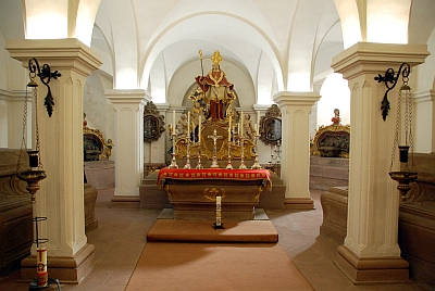 In der Krypta kann man noch den römischen Bau erkennen. Die Sarkophagaltäre, andere Reliquien und der Paulinus-Grabaltar sind von Tiez reich verziert. Am Friedhofseingang südlich der Kirche kann man die lebensgroßen Statuen der Apostel Petrus und Paulus sehen.
