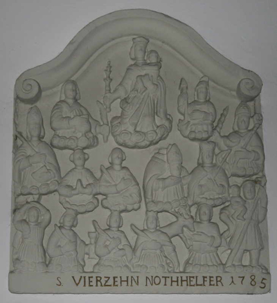 [...] Das tonnengewölbte Innere beherbergt Ausstattungsstücke der Kreuzkapelle, so die Kreuzigungsgruppe von Nikolaus Hebner, Anfang 18. Jahrhundert, und das Relief der 14 Nothelfer von 1785, das die Giebelwand des Vorgängerbaus schmückte.