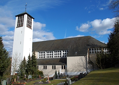 Dreischiffiger Satteldachbau mit Chor auf parabelförmigem Grundriss und quadratischem Turm mit Pyramiddach, 1954–56, Architekt Hans Geimer, Bitburg; angebaut an den neugotischen ehemaligen Chor der ehemaligen Filialkapelle (1882–84, Dombaumeister Reinhold Wirtz); am Kirchenbau der 1950er Jahre Buntglasfenster, 1955, von Reinhard Hess, im Turmeingang Grisailleglasfenster, 1977 von Jakob Schwarzkopf; Ausstattung von Hans Apel und Klaus Apel. [1]