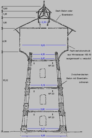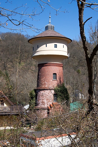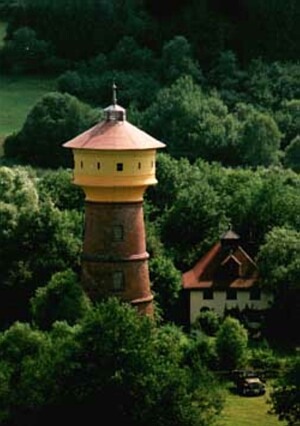 1902 von der Königlich-Preußischen Eisenbahn errichteter Hochbehälter, bis 1970 in Betrieb als Wasserreservoir für Versorgung von Dampflokomotiven. [2]
