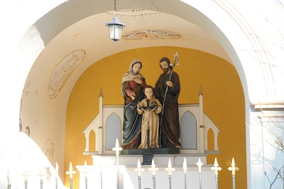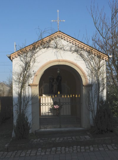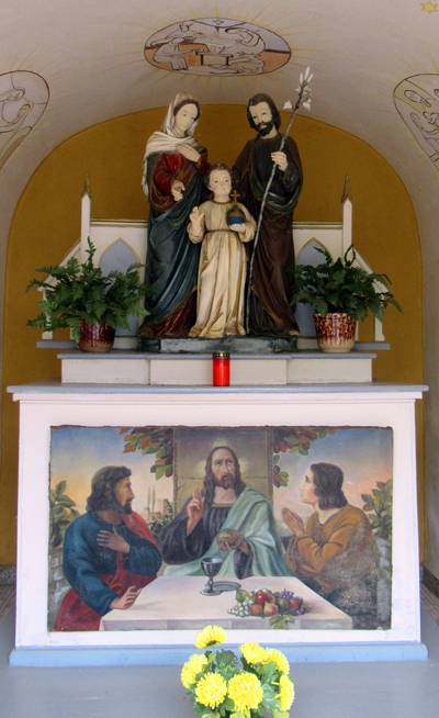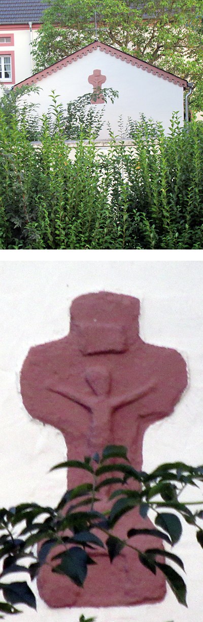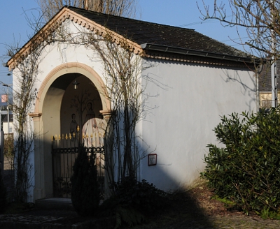 Das tonnengewölbte Innere öffnet sich in einem korbbogigen Sandsteinportal; Giebel und Traufe betonen Zierverschalungen. Im rückwärtigen Giebel eingemauert ein Kruzifix mit Korpus aus einem Stück, derbe Arbeit etwa Mitte des 18. Jahrhunderts und ursprünglich Teil eines Wege- oder Grabkreuzes. [1]