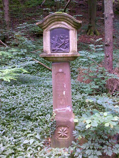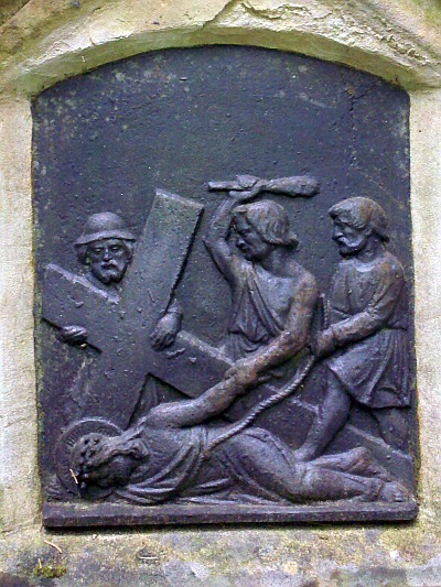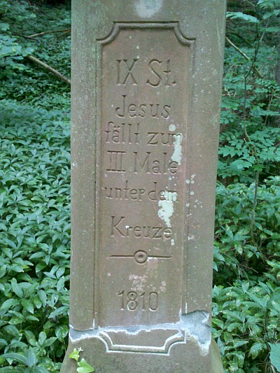 Von den ehemals 14 Kreuzwegstatiorfen fehlt die erste. Die Datierungen an der zweiten (1820) und an der neunten Station (1810) grenzen den Errichtungszeitraum ein.
