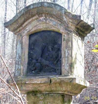 Von den ehemals 14 Kreuzwegstatiorfen fehlt die erste. Die Datierungen an der zweiten (1820) und an der neunten Station (1810) grenzen den Errichtungszeitraum ein.