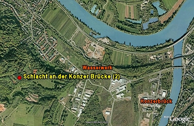 Seite 1: "ZUR ERINNERUNG AN DIE SCHLACHT AN DER CONZER BRÜCKE" und darunter: "AM 11. AUGUST 1675 ERFOCHTEN HIER DEUTSCHE TRUPPEN, KAISERLICHE, LOTHRINGER, LÜNEBURGER, MÜNSTERLÄNDER, OSNABRÜCKER, TRIERER UNTER HERZOG GEORG WILHELM VON BRAUNSCHWEIG-LÜNEBURG ÜBER DIE FRANZOSEN UNTER MARSCHALL DE CREQUI EINEN GLÄNZENDEN SIEG" sowie: "BLEIBT DEUTSCHE EINTRÄCHTIG! SO BLEIBT IHR MÄCHTIG"