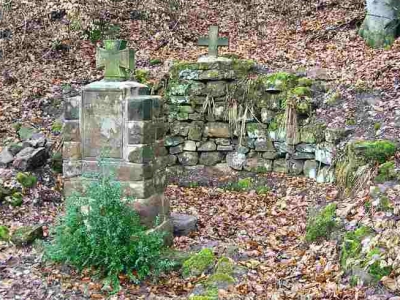 Krieger-Ehrenmal aus dem Ersten Weltkrieg, aufgestellt im Mai 1915, auf halber Berghöhe im Wald; mit Natursteinen gemauert steht es unmittelbar neben einer Felswand, dem historischen "Karthäuser Steinbruch", geschützt von einer niedrigen Stützmauer mit einem einfachen steinernen Kreuz darauf.
