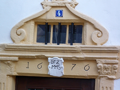 Am Sturz die Jahreszahl 1676 und im Schild die Initialen DFZ, MMS (Damian Friedrich Zolly und Maria Magdalena Steuß).