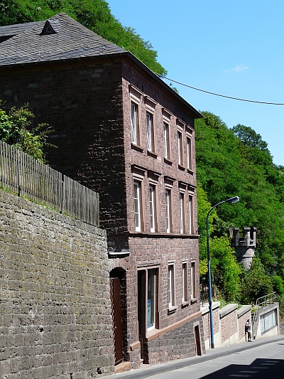 Dreigeschossiges, traufständiges Wohnhaus auf der Straßennordseite, unmittelbar vor der senkrecht abgearbeiteten Felswand stehend. In den Kellersockel offenbar eine bereits vorher vorhandene und heute noch westlich des Hauses weiterführende Stützmauer einbezogen, deren Lagerfugen unsachgemäß der Straßensteigung folgen.