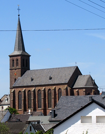 Der Grundstein zur heutigen Pfarrkirche wurde am 17. Juni 1876 gelegt. Sie ist im neugotische Stil weithin sichtbar auf der Anhöhe "Katz" nach Plänen des Trierer Communal-Baumeisters Massing erbaut. [1]