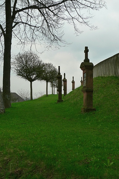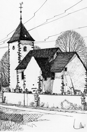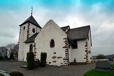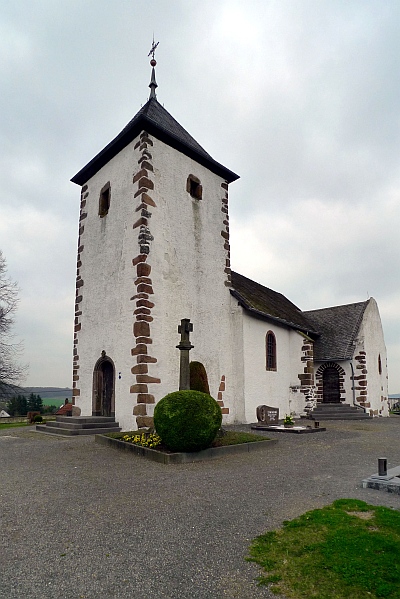 Heute Friedhofskapelle, kleiner Saalbau, 1513-15, Westturm 1545; Kirchhof mit Umfassungsmauer; Kriegerdenkmal 1914/18.