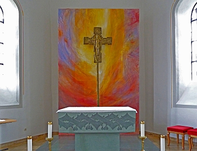 Über dem Altar erhebt sich das Altarkreuz aus Bronze. Auf diesem Kreuz ist nicht der leidende Christus, sondern der auferstandene und erhöhte Herr dargestellt. Der erhöhte und verherrlichte Herr hat die Hände weit ausgebreitet: er will die Menschen mit sich verbinden. "Und ich, wenn ich über die Erde erhöht bin, werde alle zu mir ziehen." (Joh. 12,32.)