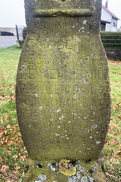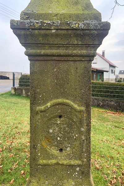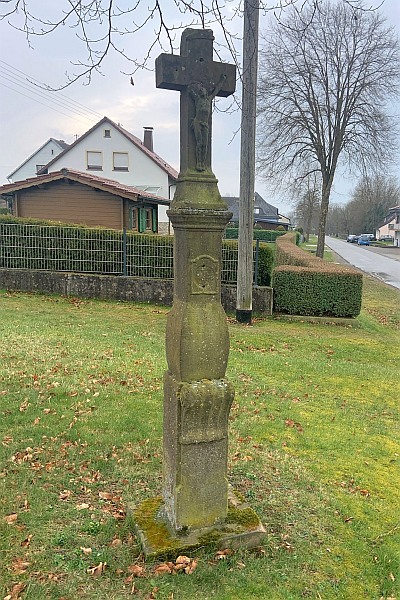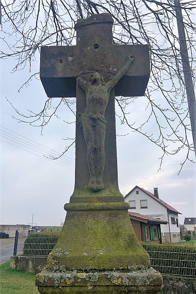 Schaftkreuz von 1830 (Inschrift) in stark verfremdeten Formen des 18. Jahrhunderts. Die Volute am Sockel, die bei den älteren Kreuzen einen Altarvorsprung trägt, hier ganz flachgedrückt, die Bauchung am unteren Schaftende erreicht etwa die halbe Schafthöhe. Charakteristisch für das 19. Jahrhundert auch die Verwendung zusätzlicher Materialien außer dem Sandstein (ursprünglich eisernes Medaillon am oberen Schaftteil, eiserner Korpus am großen Abschlußkreuz). [1]