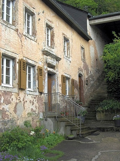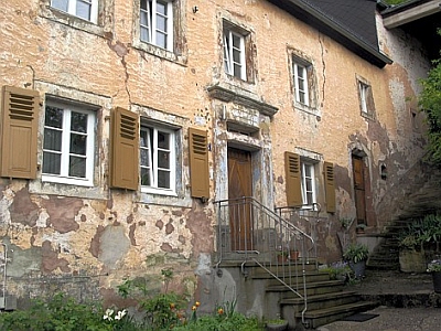 [...] Am Portal in römischen Ziffern 1797 datierter, verputzter Bruchsteinbau unter Satteldach. Der vierachsige Wohnteil wird von schlichten kleinen Rechteckfenstern und wenigen, an beiden Fronten verteilten Segmentbogenfenstern in schlichter Weise charakterisiert. Herausgehoben ist das von Pilastern eingefaßte Kämpferportal mit vorgeschwungenem Sturz und mit dem Fenster verbindenden Aufsatz (hier verteilt die Ziffern der Datierung, Erbauerinitialen und Relief einer Pflugschar).